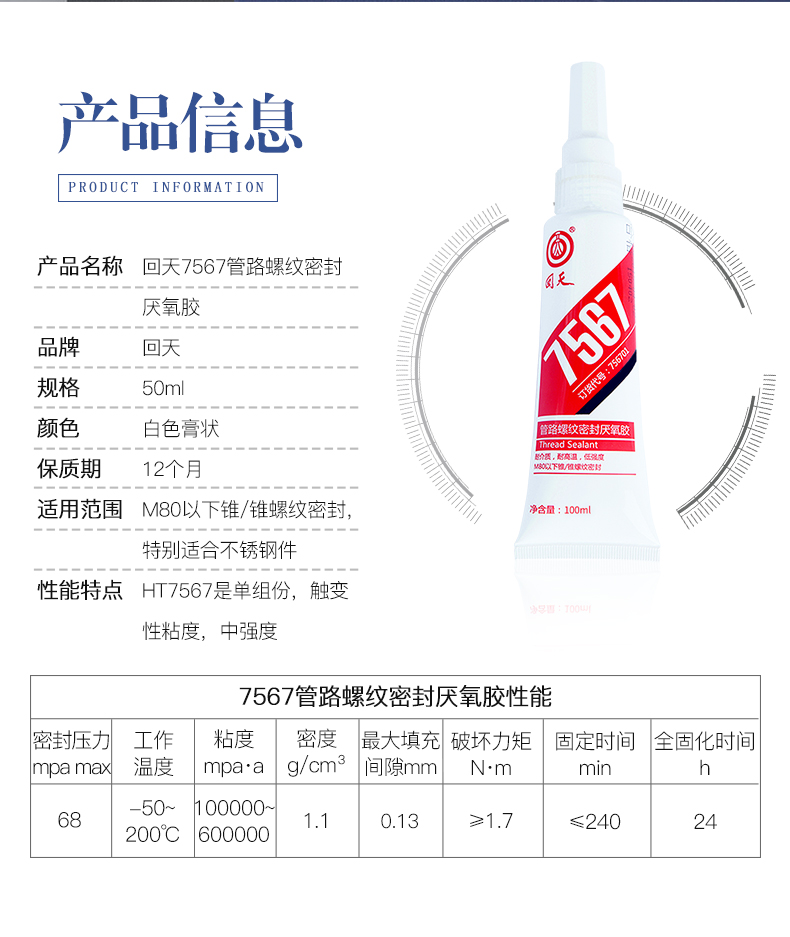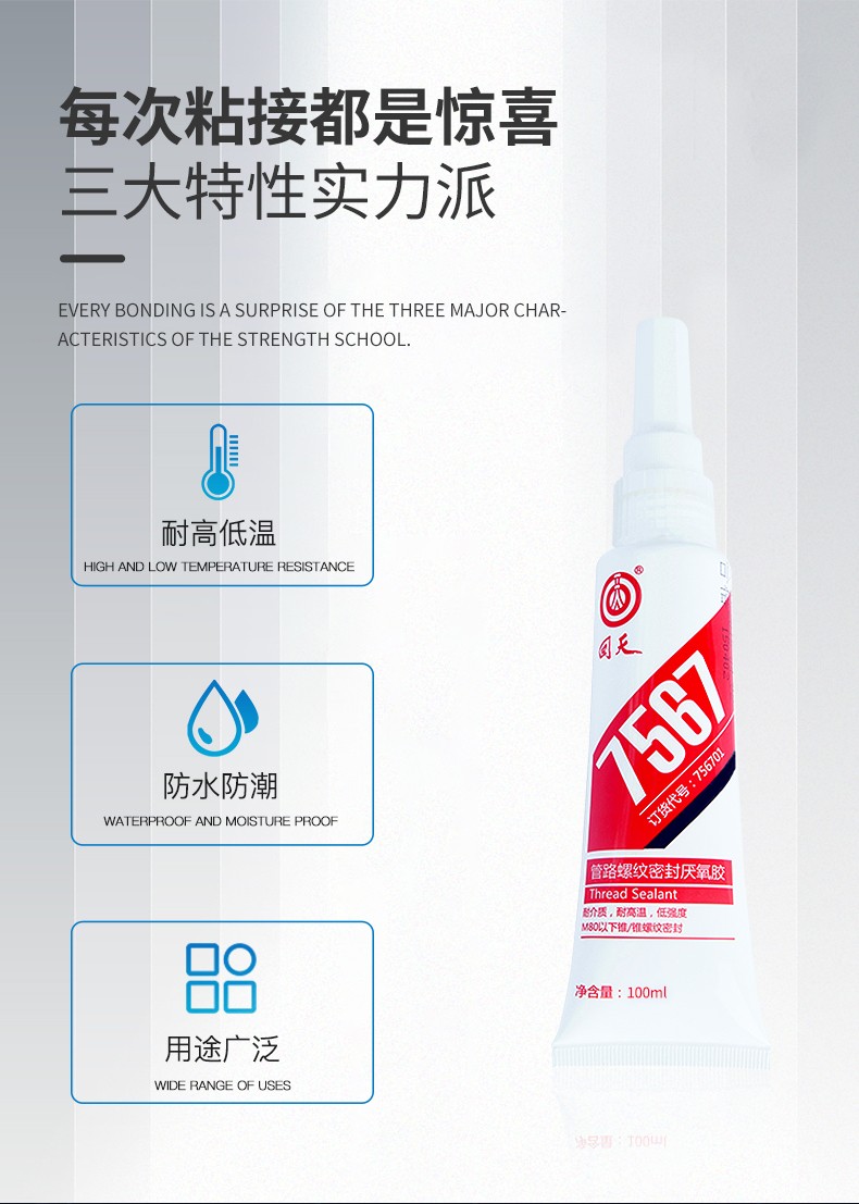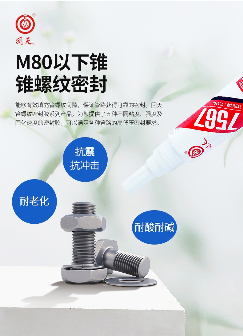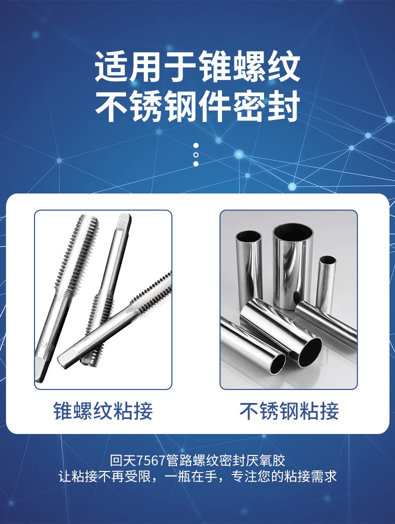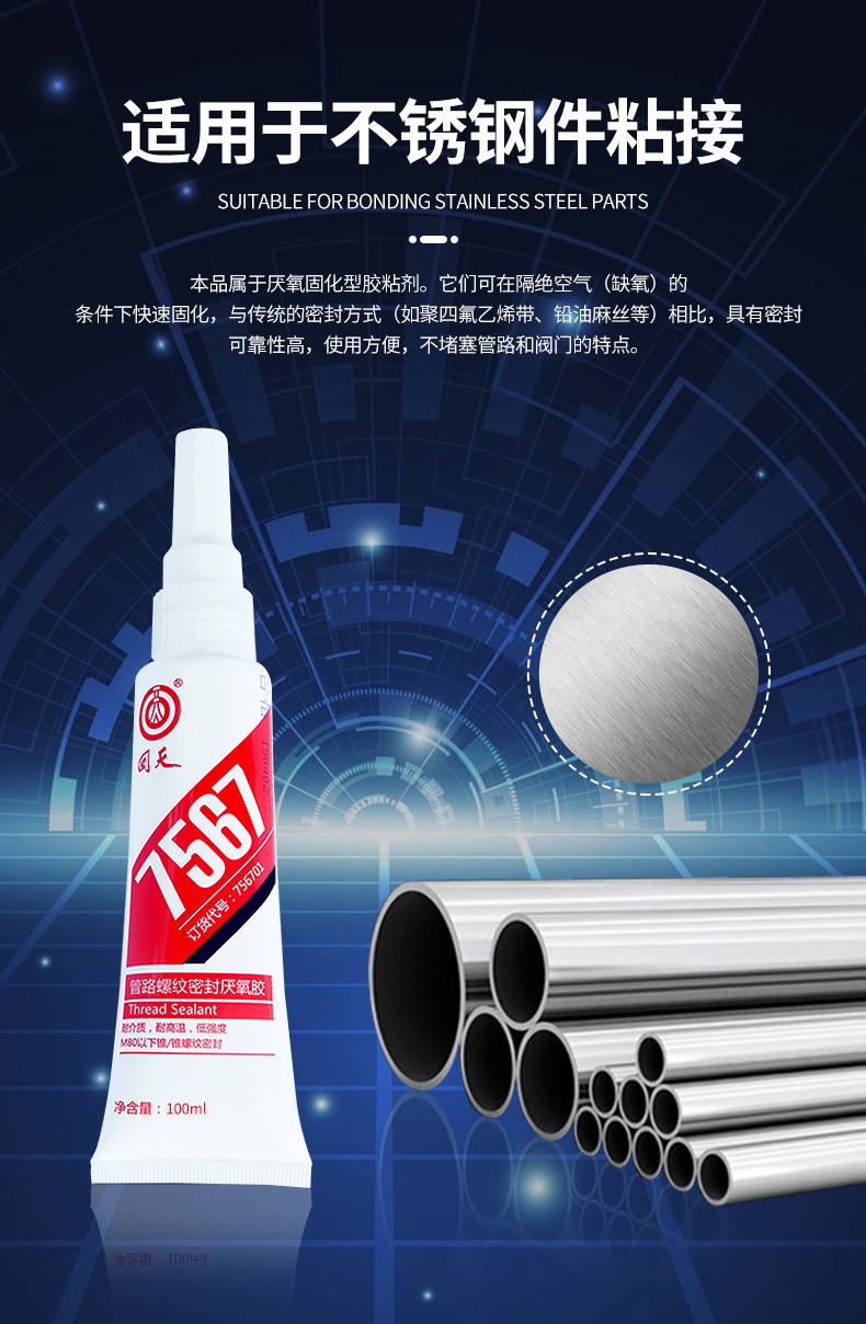 主要用涂:本品屬于厭氧固化型膠粘劑。它們可在隔絕空氣(缺氧)的條件下快速固化,與傳統的密封方式(如聚四氟乙烯帶、鉛油麻絲等)相比,具有密封可靠性高,使用方便,不堵塞管路和閥門的特點