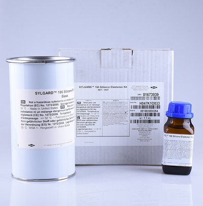 道康寧SYLGARD 186硅橡膠是由液體組分組成的雙組分套件產品,包括基本組分與固化劑?;窘M分與固化劑按10:1重量比完全混合,