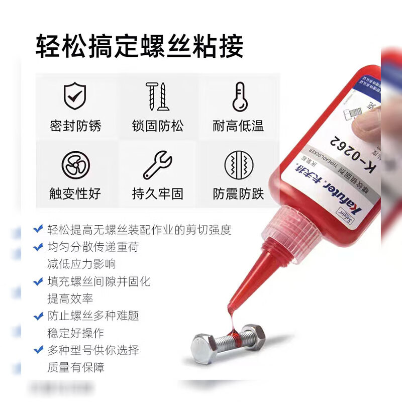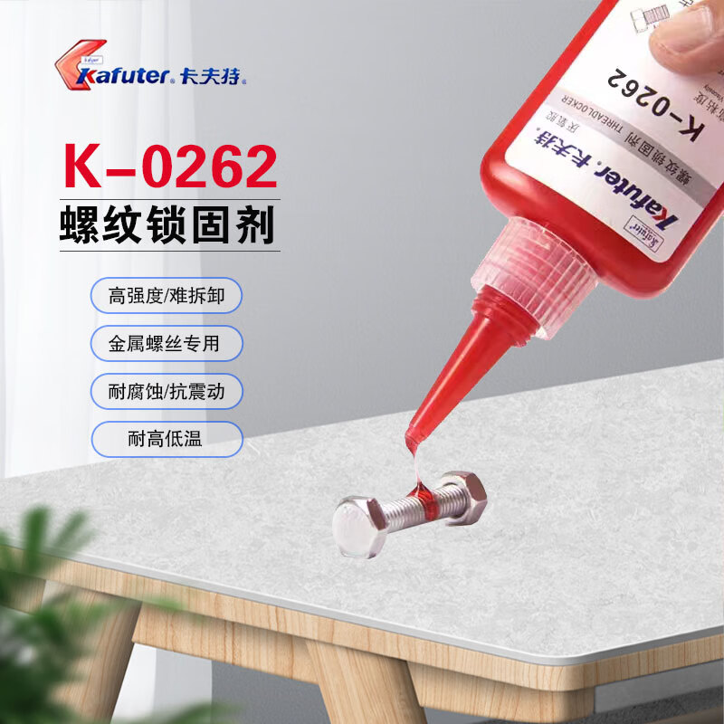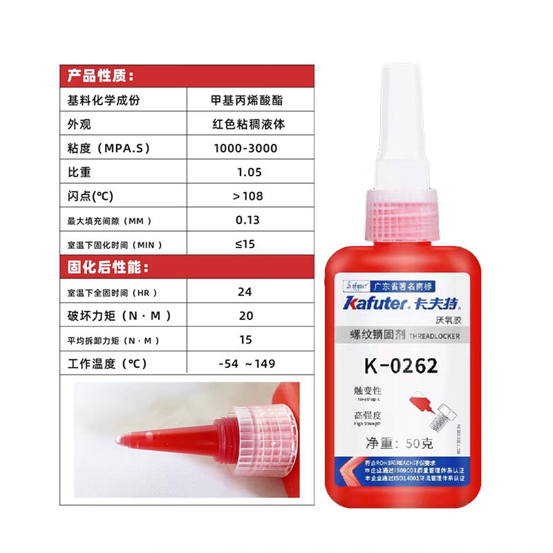 卡夫特K-0262螺紋鎖固厭氧膠是一種單組份、觸變性中粘度、高強度耐介質(zhì)性優(yōu)良的厭氧型螺紋密封劑。本螺紋密封劑在兩個緊密配合的金屬表面間,并與空氣隔絕時固化。