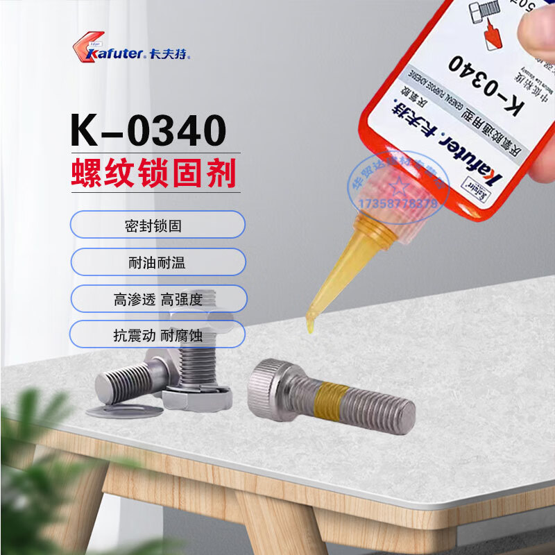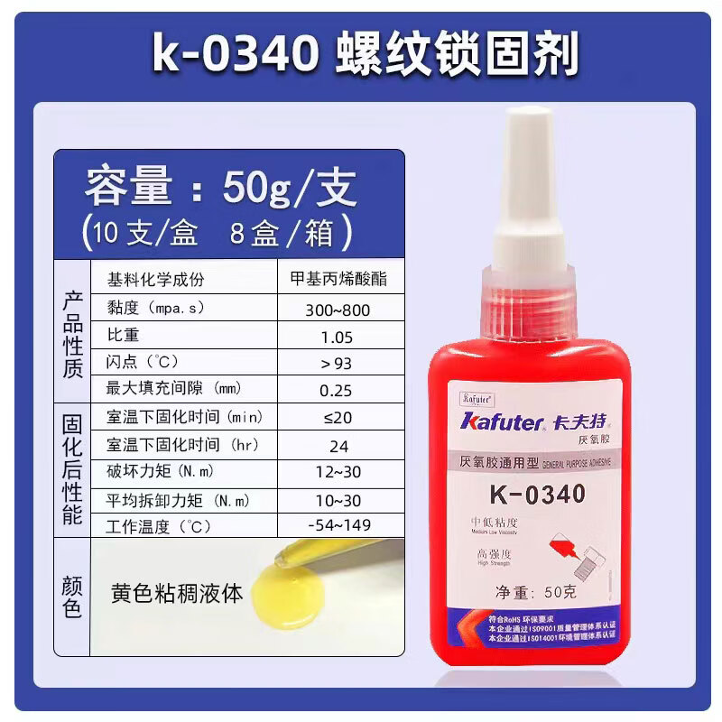 卡夫特K-0340(通用型/高強度厭氧膠)是一種單組份、觸變性粘度、高強度耐介質性優良的厭氧膠。本品在兩個緊密配合的金屬表面間,并與空氣隔絕時固化。